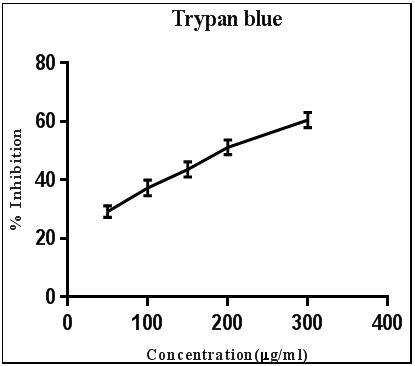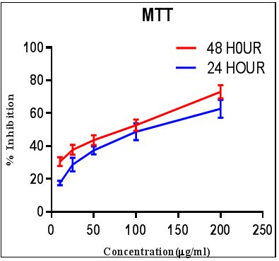 Fig. 1: (Trypan blue exclusion assay) and fig. 2 (MTT assay) are showing the results of in vitro cytotoxicity study on EAC cell line in a dose dependent way with IC50 value of 195±5.41 μg/ml for Trypan blue exclusion assay and 114±7.82 and 88.3±7.33 μg/ml for MTT assay (24 and 48 h respectively).