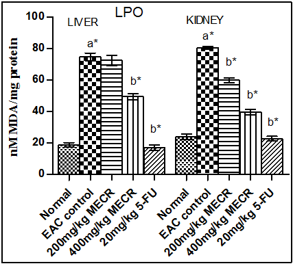 Fig. 3(a): Effects of different concentrations of MECR on lipid peroxidation. Values are represented as mean±SEM. a*p<0.05 EAC control compared to normal liver and kidney, b*p<0.05 when treated groups compared to EAC liver and EAC kidney