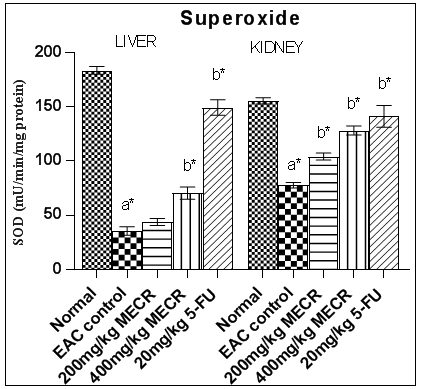 Fig. 3(b): Effects of different concentrations of MECR on SOD, values are represented as mean±SEM, a*p<0.05 EAC control compared to normal liver and kidney, b*p<0.05 when treated groups compared to EAC liver and EAC kidney