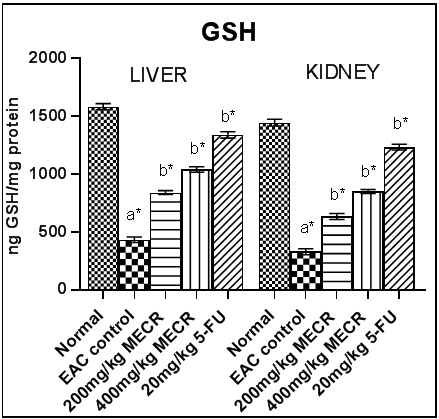 Fig. 3(c): Effects of different concentrations of MECR on GSH, values are represented as mean±SEM. a*p<0.05 EAC control compared to normal liver and kidney, b*p<0.05 when treated groups compared to EAC liver and EAC kidney