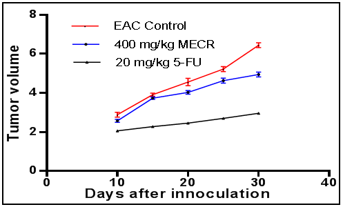 Mice were divided into three groups (n = 6). Tumor cells (1 × 106 cells/mouse) were injected into the right hind limb (thigh) of all the animals intramuscularly. The mice of group I served as control. Group II received MECR (400 mg/Kg/d, p. o.) and group III received 5-FU (20 mg/kg, i. p.). Tumor mass was measured from the 11th d of tumor induction. The measurement was carried out every 5 d for a period of 30 d. Tumor was measured using a vernier caliper at fixed intervals. The volume of tumor mass was calculated using the formula V = 4/3 πr2, where ‘r’ is the mean of ‘r1’ and ‘r2’ which are the two independent radii of the tumor mass [15]. On 31 d tumor mass was removed and weighed. % of Inhibition = [(Tumor volume of Control on 30th D–Tumor Volume of Treated on 30th d)/(Tumor volume of Control on 30th D)] x 100
