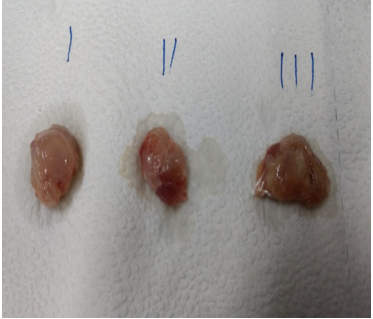 Fig. 5: Representative photographs of tumor size where (iii) means EAC Control, (ii) means 5-FU20 mg/kg and (i) means MECR400 mg/kg