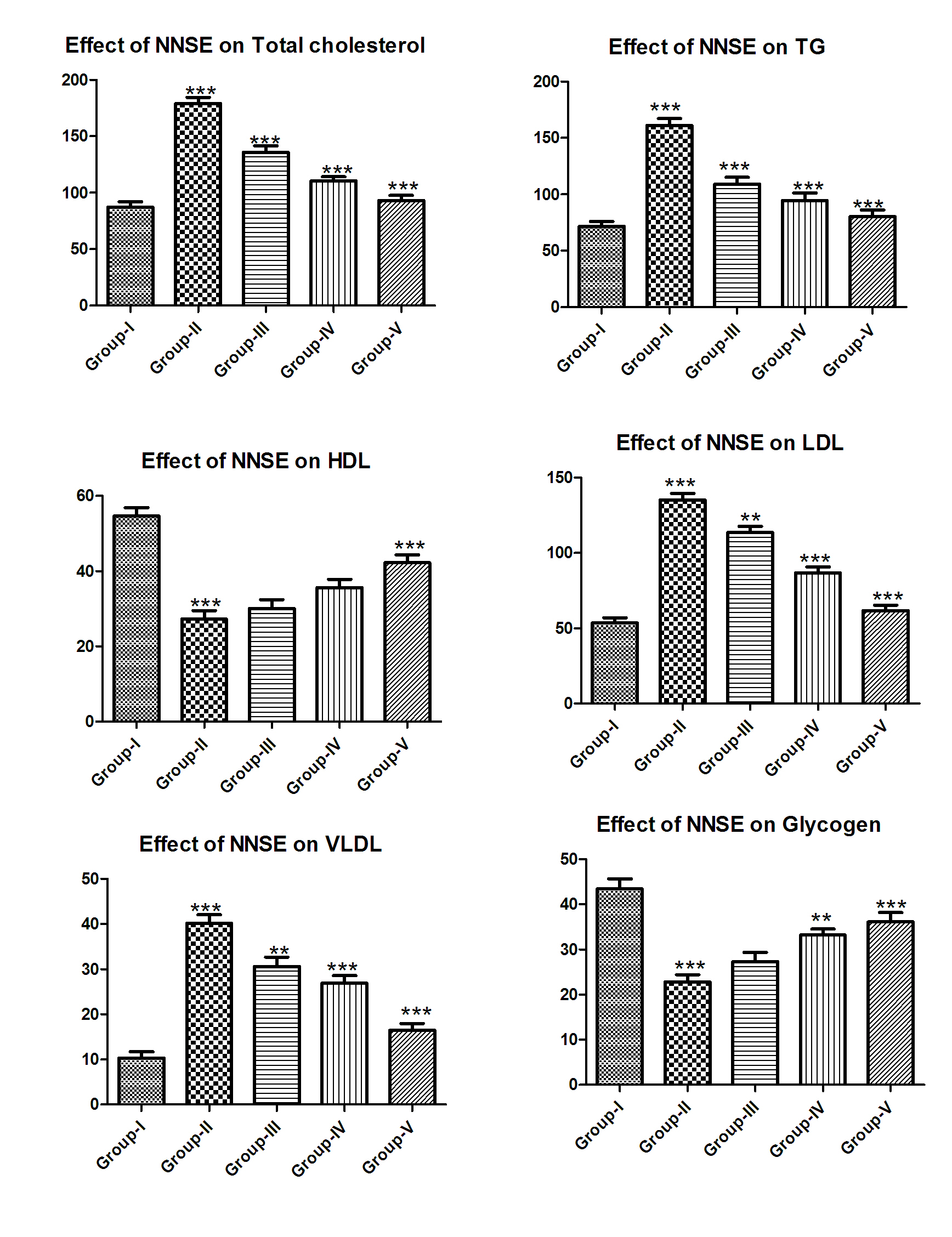 The treatment with NNSE (200 and 400 mg/kg) showed significant (p<0.05) reduction in cholesterol level (132.52±1.15 and 110.22±1.15 mg/dl) as compared with the diabetic control group (179.09±0.98 mg/dl) after a few weeks of treatment. Treatment with NNSE significantly (p<0.05) decreases the triglyceride level (TG) level as compared with the diabetic control group. Similarly, there was a significant reduction in the levels of low-density lipoprotein (LDL) from (128.96±1.05 to 82.88±0.57 mg/dl) with the NNSE at 400 mg/kg body weight doses compared with the diabetic control group. Moreover, NNSE and the standard drug group showed significant reduction (p<0.05) in very low-density lipoprotein (VLDL) level when compared with the diabetic control group. It was observed from the results that the serum levels of total cholesterol (TC), triglyceride (TG), very low-density lipoprotein (VLDL) and low-density lipoprotein (LDL) was significantly increased on the other hand serum high-density lipoprotein (HDL) level was significantly (p<0.05) decreased in diabetic rats compared to a normal control group. After treatment with the NNSE at 200 and 400 mg/kg body weight doses the levels of TC, TG, VLDL, and LDL were significantly decreased, with significantly increased serum HDL level (fig. 1).