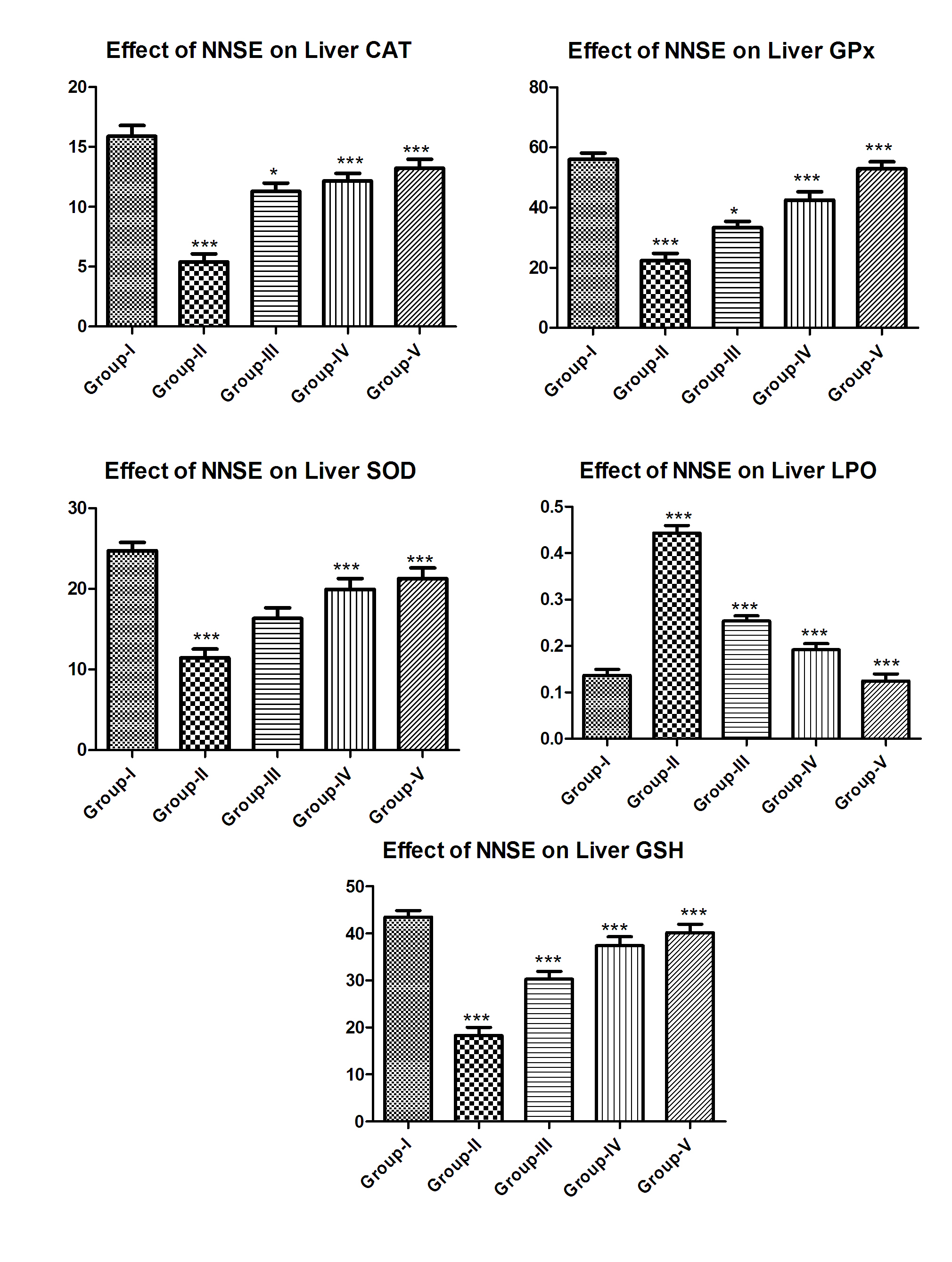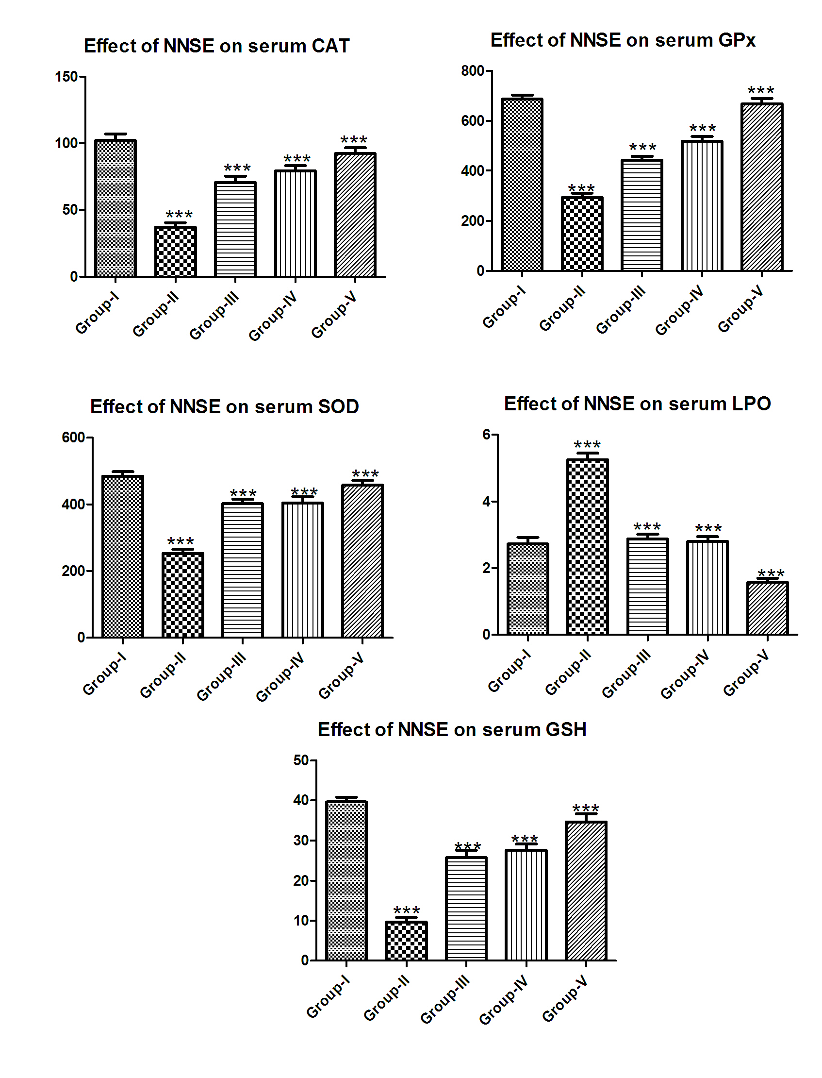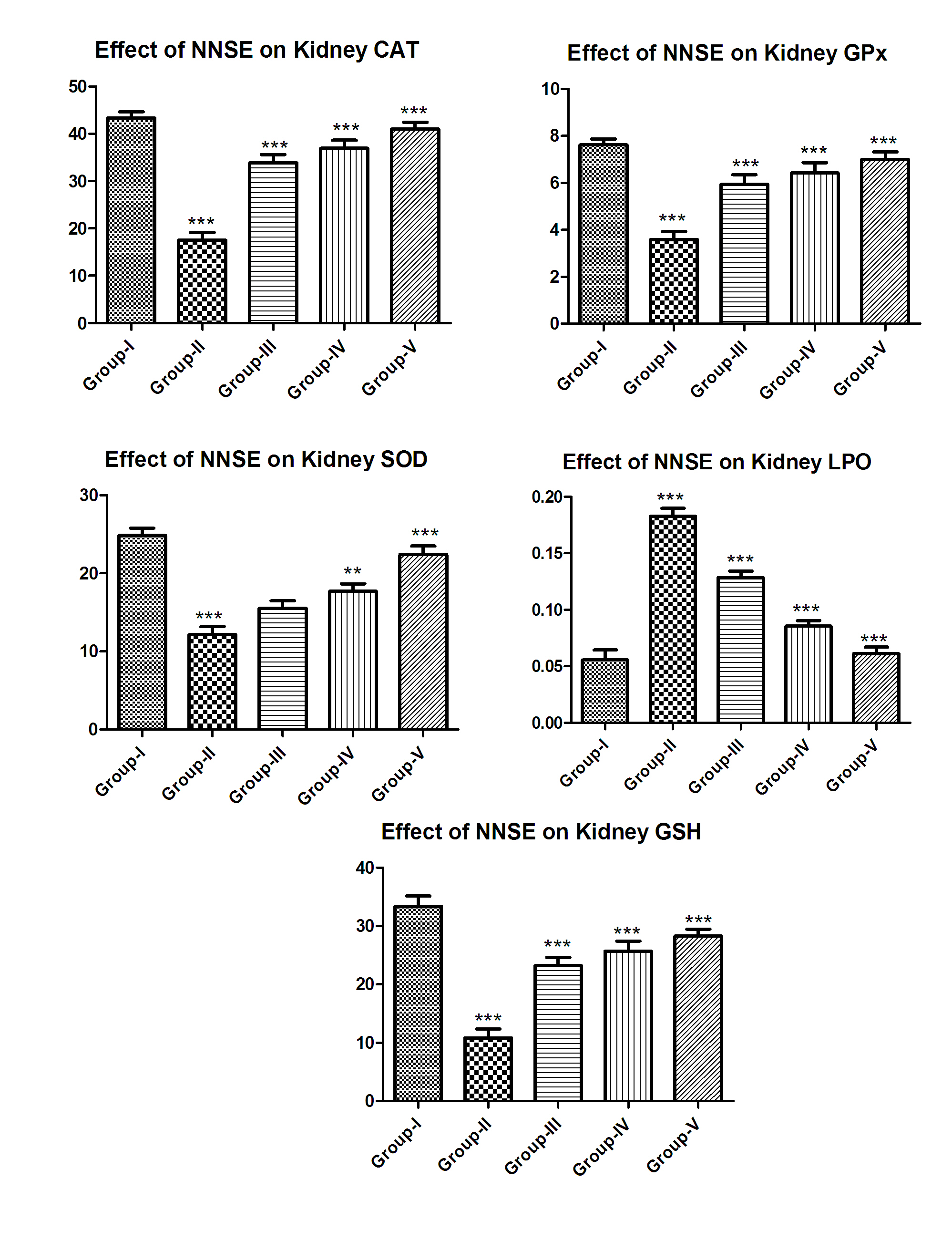 Various oxidative stress parameters like catalase (CAT), glutathione peroxidase (GPx), superoxide dismutase (SOD), lipid peroxidation (LPO) and reduced glutathione (GSH) levels were estimated in serum, liver and kidney. It was observed that diabetic rats were found to have decreased CAT, GPx, SOD and GSH enzyme in serum, liver and kidney as compared with control. Administration of seed extracts to the diabetic rats resulted in a significant (p<0.05) increase in the levels of SOD, GSH, GPX and CAT (fig. 2-4). Diabetic rats were found to exhibit significant (p<0.05) increase of lipid peroxidase in serum, liver and kidney compared to control rats. Treatment with NNSE produced significant (p<0.05) decrease in LPO. It was observed that antioxidant enzyme levels were found to be decreased in the diabetic control group as compared to a normal control group.