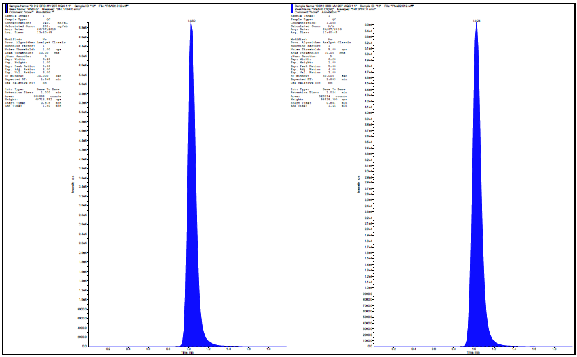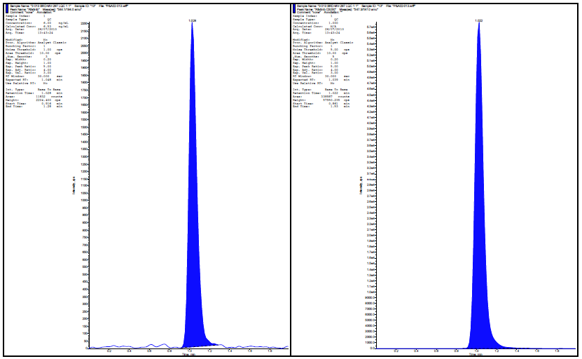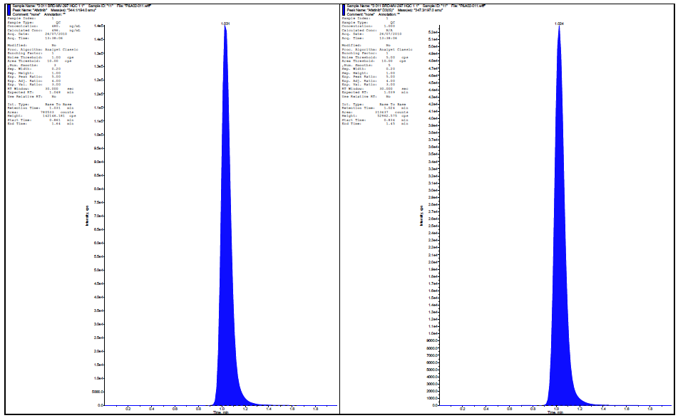 Spiked concentrations were plotted against peak area ratios of brivaracetam to the internal standard and the best fit line was calculated. Wide range calibration was determined by solutions containing 0.16µg/ml to 8µg/ml.