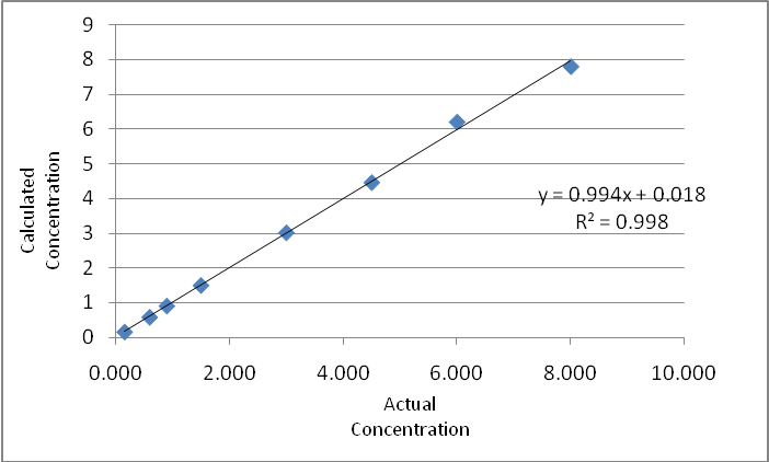 | Actual conc. (μg/ml) | 0.160 | 0.600 | 0.900 | 1.50 | 3.00 | 4.50 | 6.00 | 8.00 | Slope | Intercept |