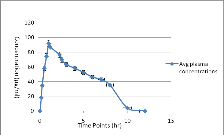 Fig. 6: Plasma time profile curves of test animals plotted between sampling time points (17) and mean (n=6) plasma concentrations