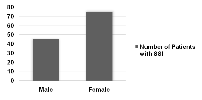 The numbers of patient studied were 120. Equal gender ratio with SSI should have been used but the Hospital had more female cases with SSI when compared to male patients. Further, the study was conducted for a short duration of time and was also done in a small number of populations.