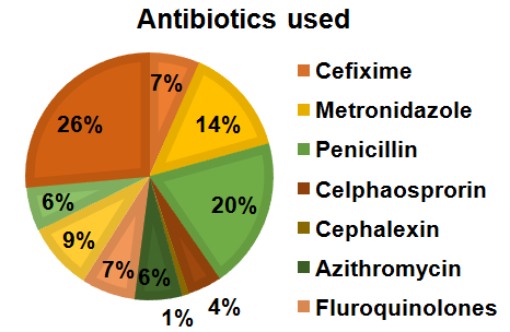 An average number of antibiotics prescribed per prescription was 2.1 which correlate with a study done [14]. Amoxicillin was prescribed more commonly 26% among 120 patients and followed by penicillin with 20%.