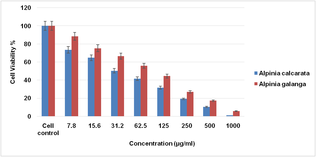 Fig. 2: Anticancer effect of the rhizome of aqueous extract of Alpinia calcarata and Alpinia galanga against HepG2 Human liver cancer cell line. Each data represents the mean from three independent experiments (mean±SD)