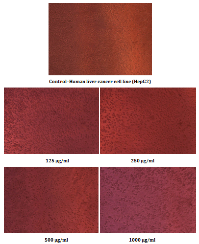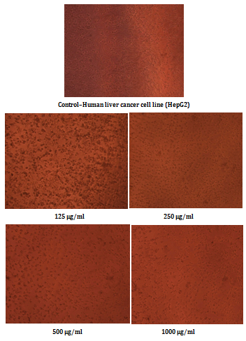 Fig. 4: Microscopic view of HepG2 cells of control and treated cells with aqueous extract of Alpinia galanga. The morphology of HepG2 cells progressively changed from 7.8 µg/ml to 1000 µg/ml concentration of the extract and was compared with control