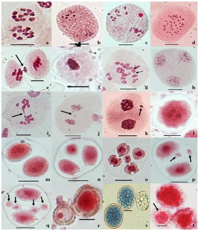 Fig.2: (Meiotic course) Androsace lanuginosaa) A PMC showing equal distribution of 10:10 chromosomes at A-I. Corydalisthyrsiflorab) A PMC showing equal distribution of 7:7 chromosomes at A-I. Gentiana argenteac) A PMC showing equal distribution of 9:9 chromosomes at A-I. Rumex nepalensisd) A PMC showing 40 bivalents at M-I. Cytomixis e) Two PMCs showing chromatin transfer. Chromatin stickiness f) A PMC showing chromatin stickiness at M-I. Inter-bivalent connections g) A PMC showing inter-bivalent connections at M-I. Abnormal spindle h) A PMCshowing abnormal spindle. Chromatin bridge i) A PMC showing Chromatin Bridge at A-I (arrowed). Laggards j and k) PMCs showing laggards at Late A-I and Telophase-I (arrowed). Abnormal sporads l) Monad. m) Dyad. n) Triad. o) Polyad. p) Dyad with two micronuclei (arrowed). q) Dyad with four micronuclei (arrowed). Pollen grains r and s) Sterile and fertile pollen grains, t) Heterogeneous sized pollen grains with micro pollen (arrowed). Scale bars=10 µm