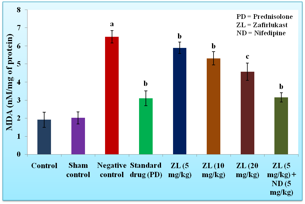Nitric oxide (NO) is a transient gaseous second messenger molecule functioning in immunity, neurotransmission and vascular regulation. The level of NO directly linked with the development of brain damage in strokes and other neuropathological disorders in humans [42]. The pretreatment with high dose of zafirlukast (20 mg/kg, p. o.) decrease more significantly serum nitrite level as compared to the low and medium dose of zafirlukast (5 and 10 mg/kg, p. o.), zafirlukast (5 mg/kg, p. o.) and nifedipine (5 mg/kg, i. p.) in combination reduced more significantly serum nitrite level as compared to individual administration of zafirlukast.