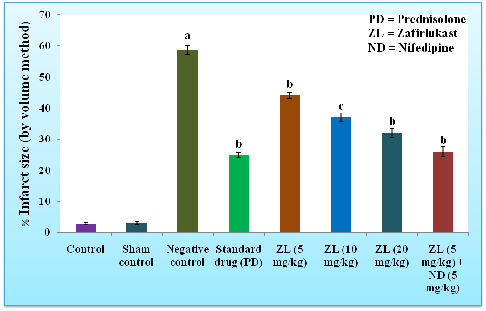 Fig. 4: Effect of zafirlukast on global cerebral ischemia/reperfusion injury induced cerebral infarct size in mice by volume method. All data are expressed as mean±SEM, n = 6, a = p≤0.001 Vs control group; b = p≤0.001 Vs negative; c = p≤0.01 Vs negative control group