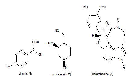 Results: Phytotchemical analyses led to the isolation of three known nitrogenous compounds: two cyanoglucosides named dhurrin and menisdaurin and an indole alkaloid, serotobenine. These nitrogen-containing compounds showed potent cytotoxic activities against the microcrustacean Artemia salina (brine shrimp), when two of them exhibited efficient bactericidal effects against a few Gram cocci. This newest co-occurrence of both α- and γ-hydroxynitrile glucosides within the same species suggested another biosynthetic pathway for putative tyrosine-derived non-cyanogenic cyanoglucosides.