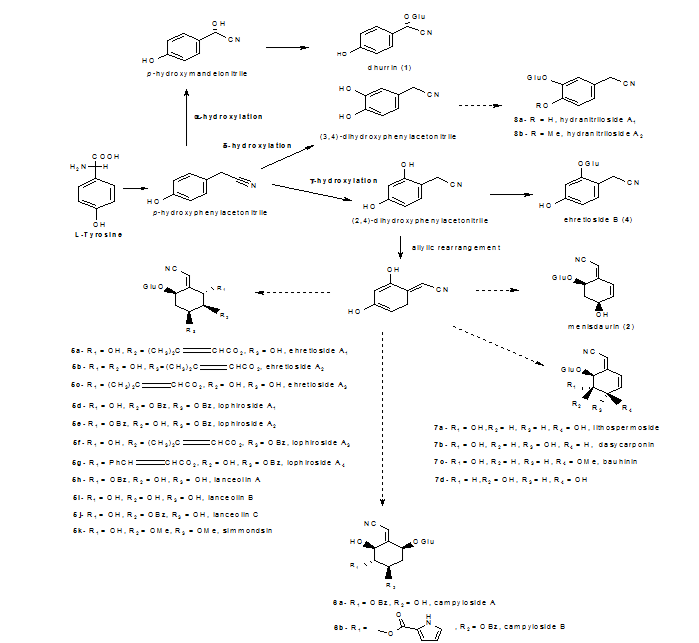 Note: p-hydroxyacetonitrile is most likely the common intermediate in the biosynthesis; hydroxylations can therefore take place at α-, β- or γ-position of the nitrile group.