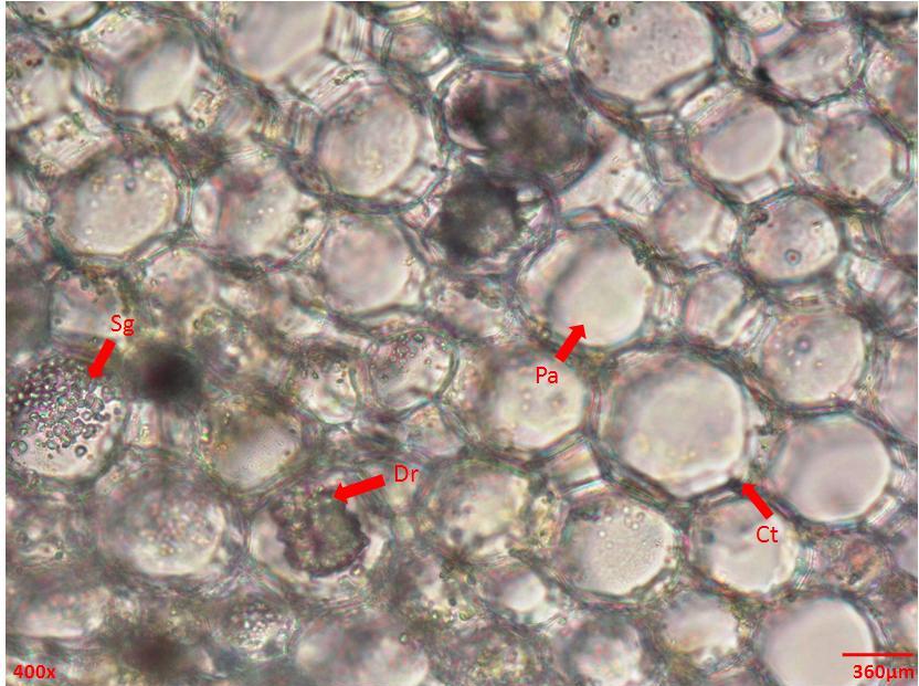 Along with spongy parenchyma, some of the large globular parenchyma cells are present without chloroplast. Idioplast cells and druses type of calcium crystals are found in the spongy parenchyma. Bundle sheaths and vascular bundles are found. Globular starch grains are present in some of the epidermal cells and spongy parenchyma [13].