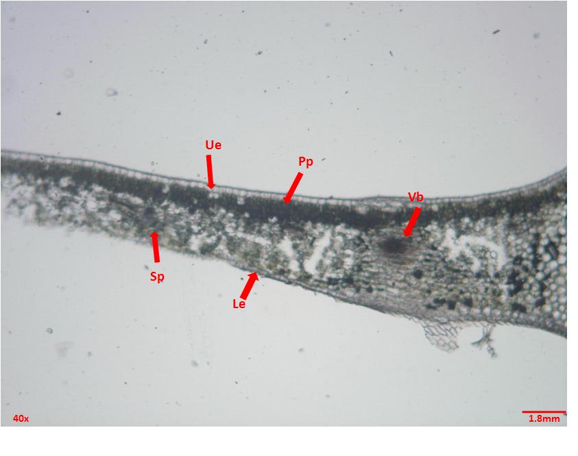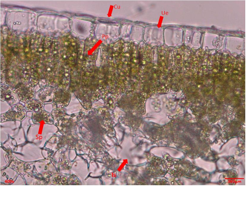 The transverse section of the lamina (fig. 2a, 2b) contains upper and lower epidermis with rectangular shaped cells. Upper epidermal cells are larger than the lower epidermal cells. In some places, the epidermal cells are arranged in two rows. Both upper and lower epidermis contain thick cuticle. The outer wall of upper epidermis shows projections. Palisade cells are found as both shorter and elongated structures. Spongy parenchyma is several layered with large intercellular spaces.