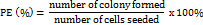 The number of colonies formed was counted manually by measuring each of colonies using a ruler. The colony was counted if the diameter measured more than 1 mm. The formula for calculating PE: