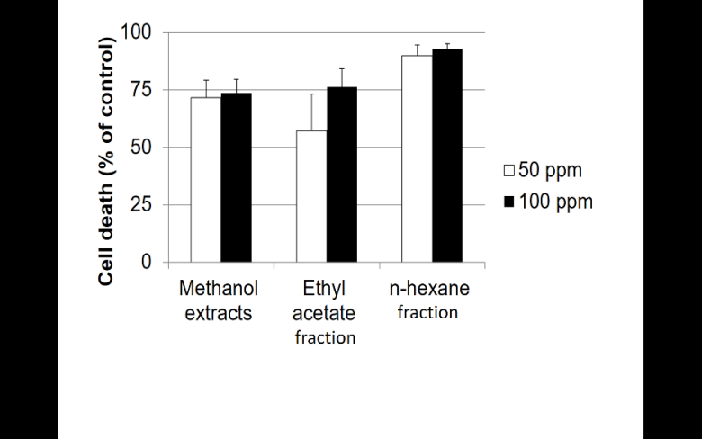 We started with an evaluation of cytotoxic activity of different extract or fraction of Sarang Semut in Coco-2 cells. Our data showed that the n-hexane fraction induced more cell death of Caco-2 cells compared to the methanol extract as well as ethyl acetate fraction (fig. 1). Percentage of cell death was 56.27, 88.43 and 70.38 upon treatment of 50 ppm of methanol extract, n-hexane fraction and ethyl acetate fraction, respectively. Moreover, both concentrations of 50, as well as 100 ppm of n-hexane fraction, triggered cell death more than 80% indicating that n-hexane fraction is promising to be evaluated further.
