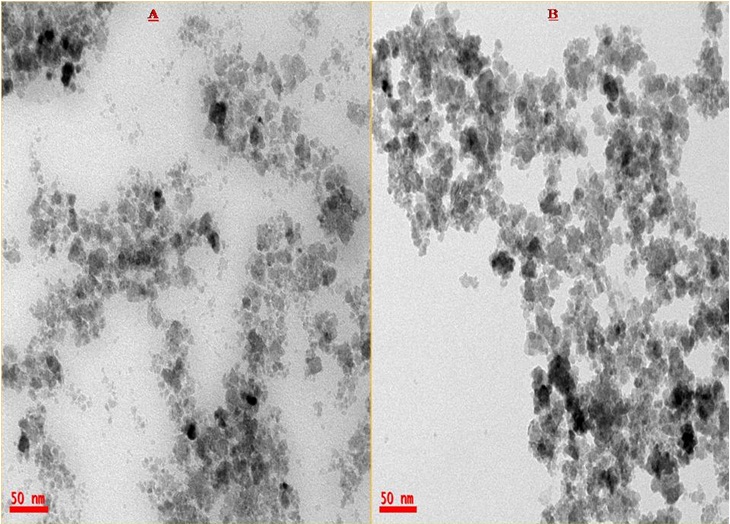 Fig. 1: Characterization of TNP 20 and ZNP 20 particles by transmission electron microscopy (TEM). A-B: A. TNP 20; B. ZNP 20; all dispersions contained nanosized particles; however the particles were mostly dispersed as agglomerates or aggregates