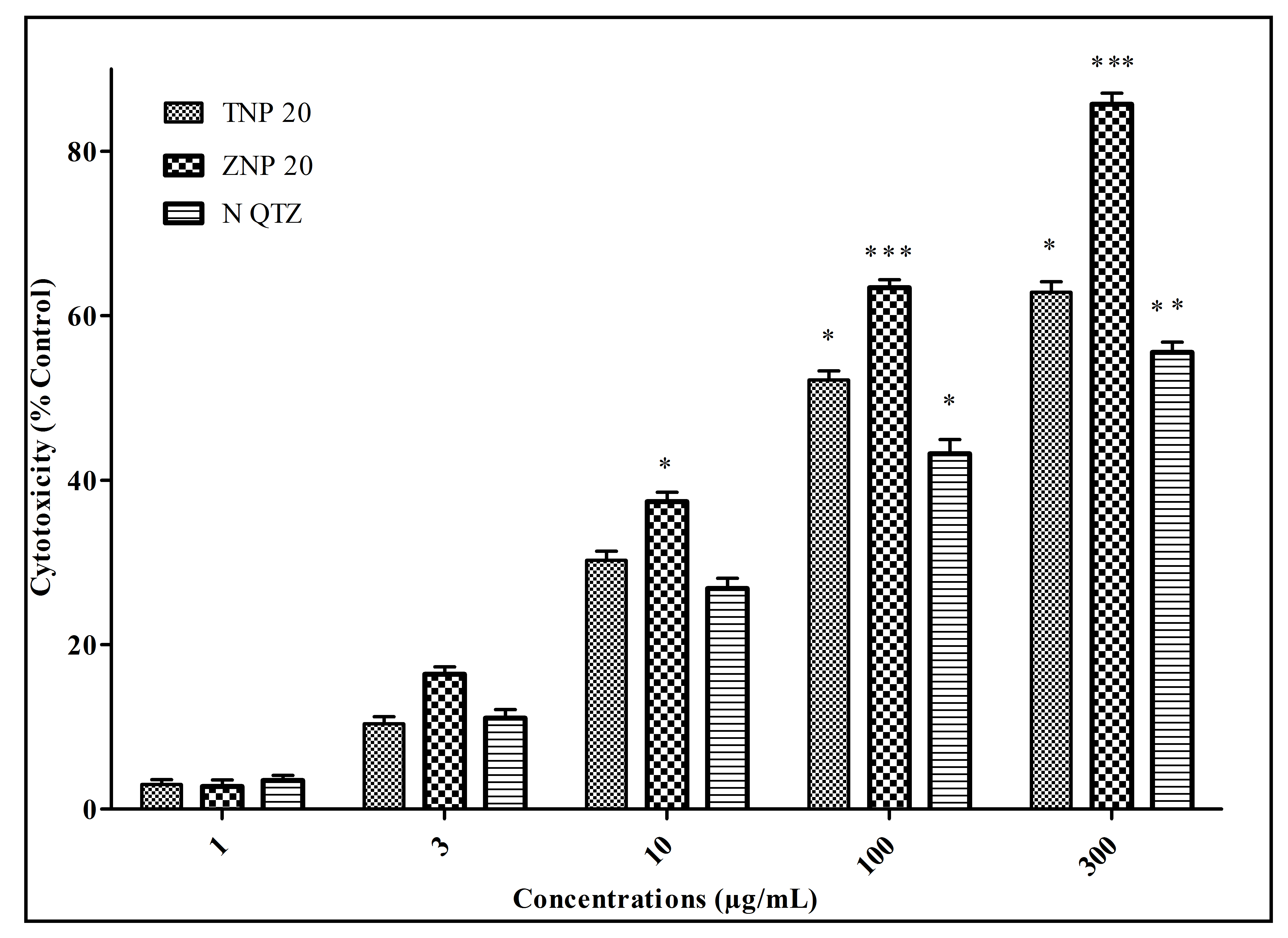 Fig. 7: Percent of cytotoxicity measured by MTT assay on human lung (A549) cells exposure to TNP 20 and ZNP 20 concentrations (1-300 µg/ml) for 48 h. Data are mean±standard deviation (SD) n = 3. Stastical analysis was performed using one-way ANOVA followed by bonferroni post-hoc test. *p<0.05, ***p<0.001, **p<0.01 versus control