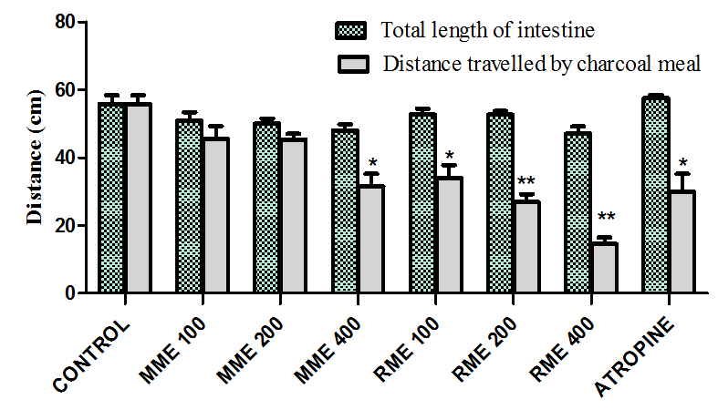The effect of MME and RME on gastrointestinal motility was assessed using the castor oil-induced intestinal motility in mice method [21]. Briefly, adult mice of either sex were fasted for 18 h and divided into eight groups (n = 6). Castor oil (0.3 ml) was administered orally to the animals. One hour later, animals in group I received 0.2 ml/kg tween 80 (3% v/v) and served as control, group II received atropine (3 mg/kg) and served as the standard while groups III, IV,V and VI,VII, VIII received MME and RME (100, 200 and 400 mg/kg) respectively. One hour after intraperitoneal administration of treatments, animals received 0.2 ml of charcoal meal (0.5 ml of 10% charcoal suspended in 10% gum acacia) orally. One hour later, the animals were sacrificed by an overdose of ether anesthesia and the small intestine was carefully separated from the mesenterum avoiding being stretched. The length of intestine from pyloric sphincter to the ileo-cecal junction(caecum) and the distance travelled by the charcoal meal were measured. For each animal, gastrointestinal transit was calculated as the percentage distance travelled by the charcoal meal relative to the total length of the intestine. The inhibitory effect of MME and RME on gastrointestinal transit was calculated relative to the control.