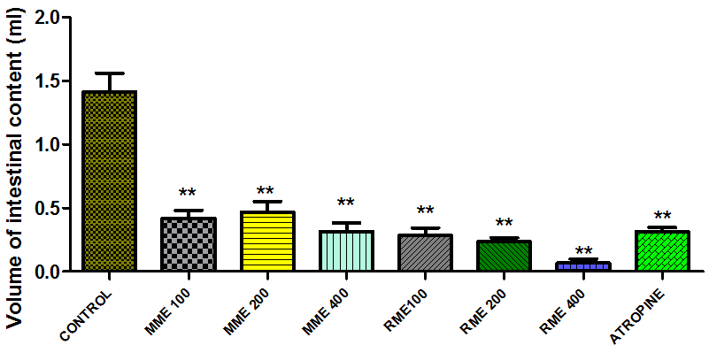 The tested extracts showed a significant reduction in intestinal volume with RME exhibiting a higher and dose dependent effect unlike MME. RME at 400 mg/kg exhibited the highest (95.1%) while MME at 200 mg/kg produced the least reduction (62.7%) in the volume of intestinal contents respectively. At all doses tested, RME gave a higher inhibitory effect on enteropooling (80%, 83%, 95.1%) than the reference drug, atropine even at 6 mg/kg(77.5%) as depicted in fig. 2.