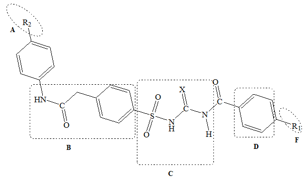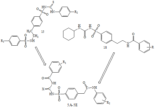 Objective: The present work deals with the designing, scoring, synthesis and, characterization of 1-(4-(2-(4-Substitutedphenylamino)-2-oxoethyl)phenylsulfonyl)-3-(4-substitutedbenzoyl)urea (5A-5B),1-(4-(2-(4-substitutedphenylamino)-2-oxoethyl)phenylsulfonyl)-3-(4-substituted-benzoyl)guanidine(5C-5E) and, 1-(4-Substitutedbenzoyl)-3-(4-(2-oxo-2-(piperazin-1-yl)ethyl)phenylsulfonyl)urea (5F-5H) based derivatives as hypoglycemic agents.