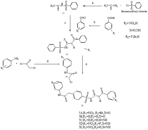 Compound 1 was synthesized by reacting benzene sulphonyl chloride with an excess amount of urea/guanidine in the presence of pyridine (0.2 ml) under reflux condition for 5 h. The reaction mixture was monitored by thin layer chromatography. Different derivatives (NO2,H and F) of benzene carboxylic acid were converted into benzene carbonyl chloride 2 with the help of SOCl2 under reflux condition for 3 h. Compound 1 was dissolved in absolute alcohol and reacted with compound 2 under reflux condition for 2 h. Pyridine (0.2 ml) was taken as a catalyst. The reaction mixture was poured into ice-cold water; solid product was isolated and recrystallizes with rectified spirit. Various derivatives of aniline (F, and Br) were stirred with chloro acetyl chloride under the cooling condition for 4 h in fuming hood. After addition of ice cold water in a reaction mixture, solid crystals were isolated.