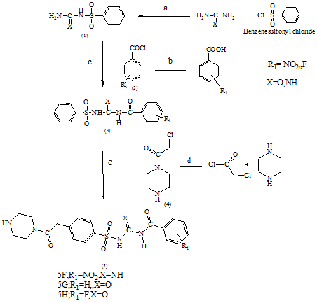 Fridal crafts alkylation was performed to prepare1-(4-(2-(4-Substitutedphenylamino)-2-oxoethyl) phenylsulfonyl)-3-(4-substi-tutedbenzoyl)urea 5A-5B and 1-(4-(2-(4-substituted-phenylamino)-2-oxoethyl) phenylsulfonyl)-3-(4-substituted benzoyl) guanidine 5C-5E as illustrated in scheme (1), an appropriate1-(4-Substituted benzoyl)-3-(phenylsulfonyl) guanidine and N-(4-substituted phenyl)-2-chloroacetamide. Nitrobenzene was used as a solvent and anhydrous FeCl3 as a catalyst. Reflux was done for 6 h and the mixture was poured in ice cold water to get final product 5. The synthesis of piperazine derivatives 5F-5H was done as illustrated in the scheme (2), by reflux between 1-(4-Substituted benzoyl)-3-(phenylsulfonyl) urea and 2-Chloro-1-(piperazin-1-yl) ethanone for 7 h in the presence of anhydrous AlCl3 and dry DCM (50 ml) as a solvent. The entire target compounds 5A-5H were purified by recrystallization. The reaction of all targeted molecules was monitored by thin layer chromatography. Ethyl acetate and hexane was used as mobile phase.