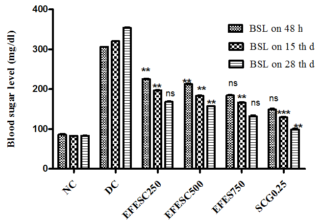 BSL of the NC group of animals did not alter throughout the experiment. In DC group BSL level increased steadily on 15th d (320±0.67) and on 28thd (354±1.1) after STZ treatment indicating the incidence of diabetes in the animals throughout the experiment (fig. 1). There were significant changes in BSL of SCG0.25 treated animals (149±2.00 mg/dl) 48 h post-STZ treatment as compared to DC group of animals (306±0.58 mg/dl) indicating the incidence of diabetes. There was a significant reduction in BSL of EFESC on 15th and 28th d in the STZ-induced diabetic rat at various dose levels.