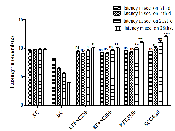 No significant change in latency was observed in NC of the animal throughout the study. For DC group of an animal, there was a gradual reduction in latency (s) was observed from day 7th (10.0±0.01) till 28thd (4.3±0.06) indicating the presence of allodynia (table 2). In the treatment group of animals i.e. EFESC with increasing dose showed significant (**p<0.01) increased in latency time (s) at 14th and 28th d was exhibited which implies the protective action of drug treatment on allodynia produced by cold water.