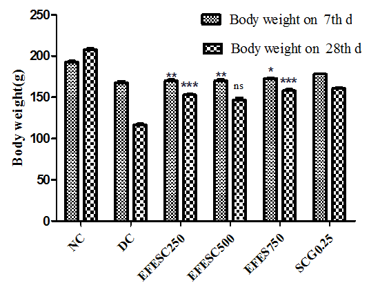 The SCG0.25 group showed significantly increased in weight as compared to DC group (fig. 3). EFESC showed a significant reduction in body weight (g) compared to NC and DC value. There was no reduction in feed intake in any of the group.