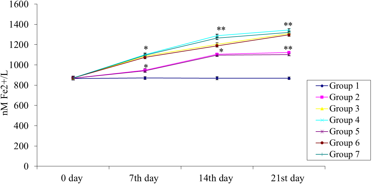 The ferric reducing ability of plasma (FRAP) level of rats after administration of methanol extracts of Limnophila heterophylla and Michelia champaca over a period of 21 d was presented in fig. 1. In the control group, there was no significant change in ferric reducing ability of plasma (FRAP) value on days 7 (870 nM Fe2+/l) 14 (869 nM Fe2+/l) and 21(868 nM Fe2+/l) compared with day 0 (864 nM Fe2+/l). But, in group II, III and IV on days 7 (947, 1088 and 1101 nM Fe2+/l, respectively), 14 (1104, 1202 and 1287 nM Fe2+/l, respectively) and 21 (1122, 1309 and 1344 nM Fe2+/l, respectively) there was a significant (p<0.05, p<0.01 and p<0.001) increase in ferric reducing ability of plasma (FRAP) value compared with day 0 (869, 870 and 871 nM Fe2+/l, respectively). Similarly, in group V, VI and VII on days 7 (941, 1075 and 1095 nM Fe2+/l, respectively), 14 (1097, 1189 and 1265 nM Fe2+/l, respectively) and 21 (1103, 1297 and 1321 nM Fe2+/l, respectively) there was a significant (p<0.05, p<0.01 and p<0.001) increase in ferric reducing ability of plasma (FRAP) value compared with day 0 (868, 870 and 871 nM Fe2+/l, respectively). Maximum enrichment of ferric reducing ability of plasma (FRAP) level was found in group IV and VII, which correspond to animals administered with 500 mg/kg body weight of the methanol extract of Limnophila heterophylla and Michelia champaca, individually.