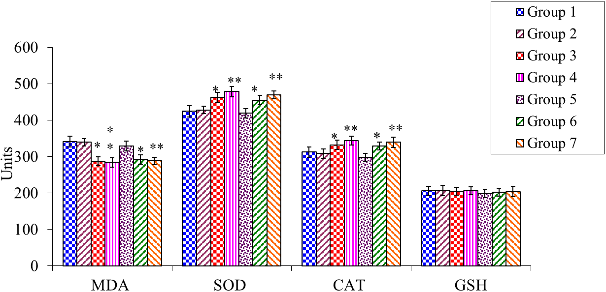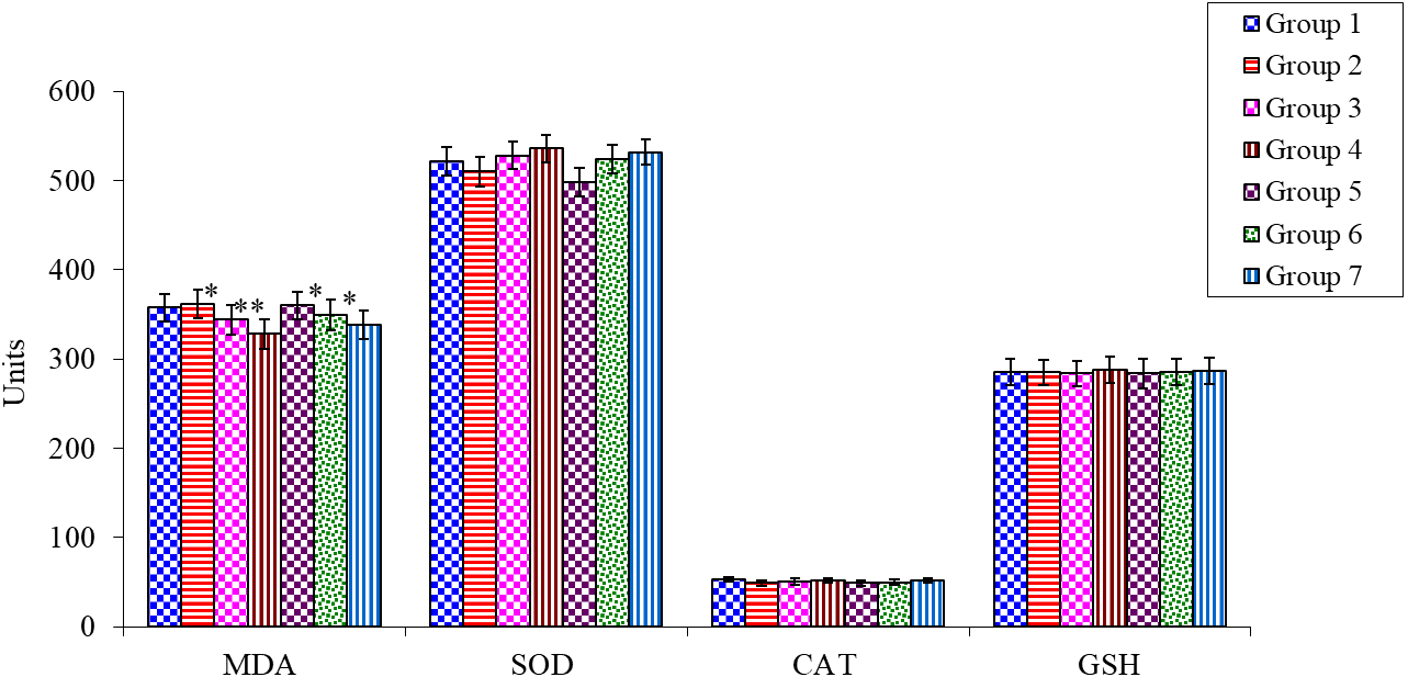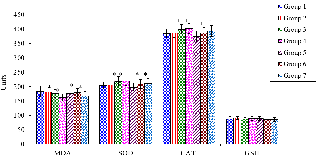 | Group | MDA (nM of TBARS mg-1of protein) | SOD U/mg protein | CAT U/mg protein |