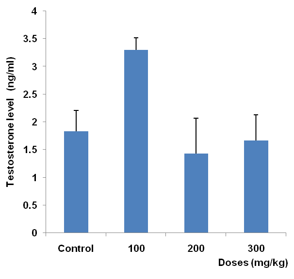 Results: The extract did not produced significant change in the mobility of sperm, the sperm count in vas deferens, the relative weight of body and accessory organs at all doses. The daily sperm production (DSP) and the weight of prostate significantly increased at a dose of 100 mg/kg (p<0.01) while the sperm count in cauda epididymis increased at a dose of 200 mg/kg. The testicular and serum cholesterol significantly increased (p<0.001) at the dose of 100 mg/kg whereas the testicular and serum proteins increased (p<0.001) at the dose of 200 mg/kg. The serum testosterone level increased following 14 d of treatment (p<0.01) at the dose of 100 mg/kg.