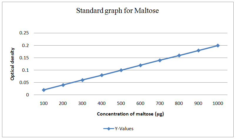 Fig. A: Standard graph for Maltose, which contains concentration of maltose on X-axis in terms of µg and optical density on Y-axis