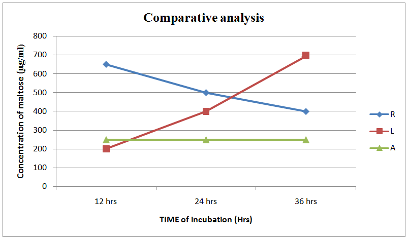 Results: On the biochemical characterization the isolates (L, A and R) were identified as Proteus sp but their production rates were distinct. The Proteus sp from highway (R) had maximum amylase production rate on 12 hrs of incubation, which was quantified to 650µg/ml of maltose/15 min and production rate was decreased on further incubation period. On contrast, the Proteus sp obtained from sewage dumped lake soil (L) had minimum amylase production rate on 12 hrs of incubation which was quantified to 200µg/ml of maltose/15 min and production rate was increased within the incubation period. The Proteus sp obtained from agricultural soil (A) had a stable amylase production rate at all incubation period includes 12 hrs, 24 hrs and 36 hrs which were quantified to 250µg/ml of maltose/15 min.