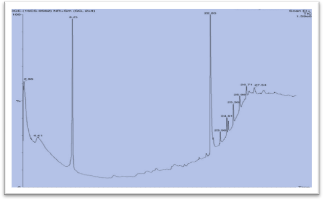 The chromatogram revealed the presence of trihydroxy bezoic acid, isosorbide dinitrate, 1,2 benzenedicarboxylic acid, mono(2-ethylhexyl) ester, di-n-decylsulfone, sulfurous acid, decyl 2-propyl ester, silane, 1,4-phenylenebis, octadecane, 9-ethyl-9-heptyl, cyclo-trisiloxane, hexamethyl.