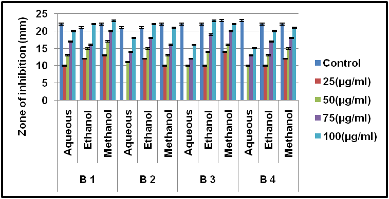 Fig. 3: Antibacterial activity of Casuarina equisetifolia bark extracts against different bacterial pathogens. Data presented are the means of three replicates. Values are expressed as mean±SD of three replicates, B1-Escherichia coli B2-Bacillus subtilis, B3-Proteus vulgaris B4-Staphylococcus aureus