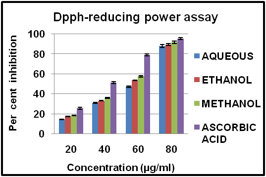 The methanol extract showed percent maximum reducing ability at 80µg concentration (83.43±0.47) followed by ethanol extract (77.18±0.32) and aqueous extract (69.37±0.28) with IC 50 value of 47.89±0.36µg/ml, 51.61±0.09 µg/ml and 57.22±0.13µg/ml respectively. The reducing power activity of standard ascorbic acid showed maximum percent inhibition of 86.87±0.83 at an 80µg concentration with IC50 value of 45.71±0.59µg/ml (fig. 8).