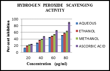 The ability of bark extracts to scavenge hydrogen peroxide was determined spectrometrically [12]. Different concentrations (20 µg/ml, 40 µg/ml, 60 µg/ml, 80 µg/ml) of various bark extracts were added to 0.6 ml of 2 mmol/l of hydrogen peroxide solution prepared in phosphate buffer (pH=7.4). Absorbance was measured at 230 nm against blank solution (phosphate buffer) using UV-visible spectrophotometer (UV 1650 Pc, Schimadzu) and was compared with the standard Ascorbic acid. Experiments were performed in triplicates.