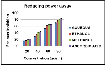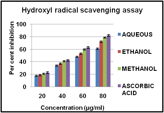 Hydroxyl radical is the most reactive oxygen centered species and causes severe damage to adjacent biomolecule. The methanol extract showed percent maximum reducing ability at 80µg concentration (78.75±0.29) followed by ethanol extract (72.08±0.06) and aqueous extract (60.83±0.94) with IC 50 value of 50.01±0.37µg/ml, 55.51±0.15µg/ml and 63.91±0.68µg/ml respectively. The reducing power activity of standard ascorbic acid showed maximum percent inhibition of (82.08±0.82) at 80µg concentration with IC50value of 47.54±0.82µg/ml (fig. 7).