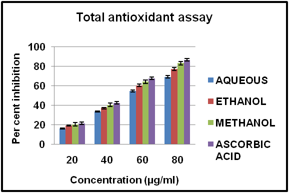 The total antioxidant capacity assay of aqueous extract, ethanol extract and methanol extracts of C. equisetifolia bark were determined by a standard method [15]. Different concentrations of C. equisetifolia bark extracts (20 µg/ml, 40 µg/ml, 60 µg/ml, 80 µg/ml) were added to 1.0 ml of the reagent solution (0.6 M sulphuric acid, 28 mmol sodium phosphate and 4 mmol ammonium molybdate. The reaction mixture was incubated at 95 °C for 90 min. After cooling, the absorbance was measured at 695 nm against a blank using UV-visible spectrophotometer (UV 1650 Pc, Schimadzu). Ascorbic acid was used as a standard. Experiments were performed in triplicates.