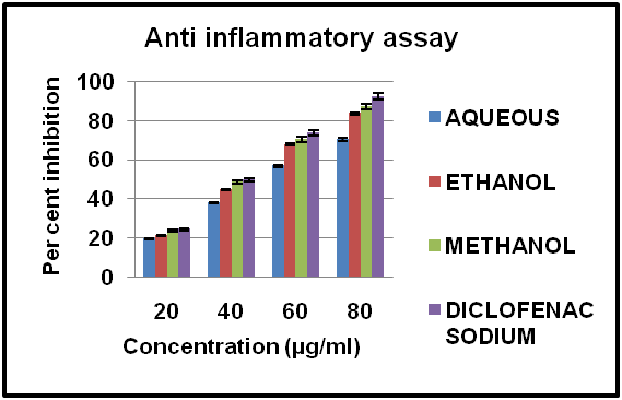 The anti-inflammatory assay was carried out using different concentrations (20, 40, 60, 80 µg/ml) of Casuarina equisetifolia bark extracts. Inhibition of thermally induced protein (albumin) denaturation was based on the concentration of different extracts. The methanol extract showed maximum percent inhibition (87.05±0.42) when compared to ethanol extract (83.52±0.62) and aqueous extract (70.29±0.14) with IC 50 value of 42.99±0.53µg/ml, 45.94±0.42µg/ml and 54.48±0.31µg/ml respectively. The anti-inflammatory activity of standard diclofenac sodium showed maximum percent inhibition of 92.35±0.7 at 80µg concentration with IC50value of 40.80±0.47 µg/ml (fig. 9).
