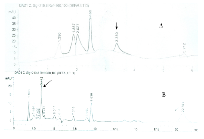 Fig. 3: HPLC chromatograms of alkamide (authentic), A and Echinacea purpurea extract obtained by MAE, B, detection 210 nm: retention time 3.380.