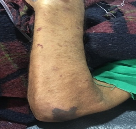 Ecchymosis is described as a large zone of skin discolouration caused by extravasation of blood into the subcutaneous tissue of the body. The onset discolouration of the skin is caused by the escape of the blood from ruptured blood vessels into the capillaries. Discolouration and exact colour of the skin represents the physiologic sequel of haemoglobin catabolism which is converted into bilirubin and hemosiderin. Ecchymosis is a common adverse effect associated with prolonged corticosteroid therapy. Senile purpura and corticosteroid-induced ecchymosis are similar and appear as large purple/brown blotches on the neck, face, or exterior surfaces of the arms and hands [1]. The pathophysiological mechanism of corticosteroid-induced ecchymosis is, after prolonged use of methylprednisolone leads to the destruction of the collagen support for small blood vessels which results in leakage of blood into surrounding tissues [2]. Prolong use of OCS also causes ulcers/gastrointestinal bleeding, osteoporosis, increased risk of heart disease and a decrease in bone density.