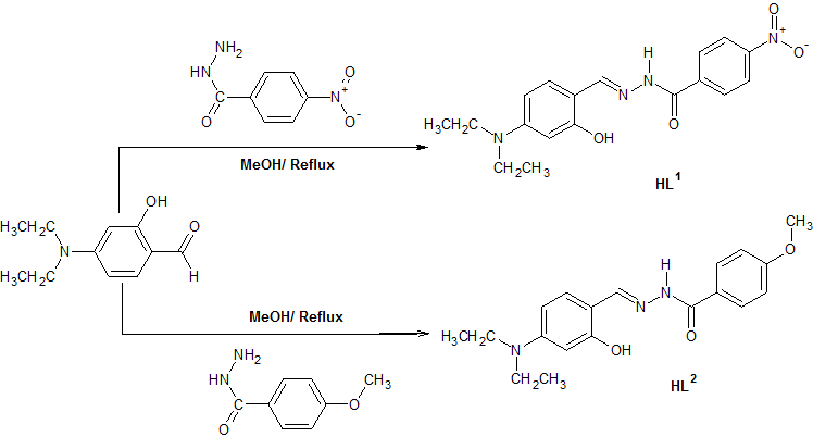 The Schiff base ligand was prepared in line with the method described in the literature [14]. Stoichiometric amounts of 4-(diethylamino)-2-hydroxybenzaldehyde (10 mmol) in methanol (50 ml) was carefully added to a stirred pre-warmed methanolic solution of 4-methoxybenzohydrazide (10 mmol) and refluxed at 70 °C for 2 h in a closed system. Consequently, the resultant mixture was cooled to room temperature and then concentrated to a volume of 20 ml. The solid product formed was recovered by filtration, washed with methanol and dried in a desiccator over anhydrous CaCl2. The synthetic pathway of the ligand is explained in scheme 1.