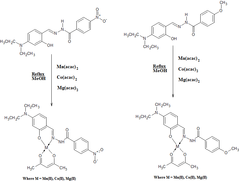 M(acac)2-Metal acetylacetonate; Co-Cobalt; Mn-Manganese; Mg-Magnesium; HL1-N'-{(E)-[4-(diethylamino)-2-hydroxyphenyl]methylidene}-4-nitrobenzohydrazide; HL2-N'-{(E)-[4-(diethylamino)-2-hydroxyphenyl]methylidene}-4-methoxybenzohydrazide; cm-centimetre.